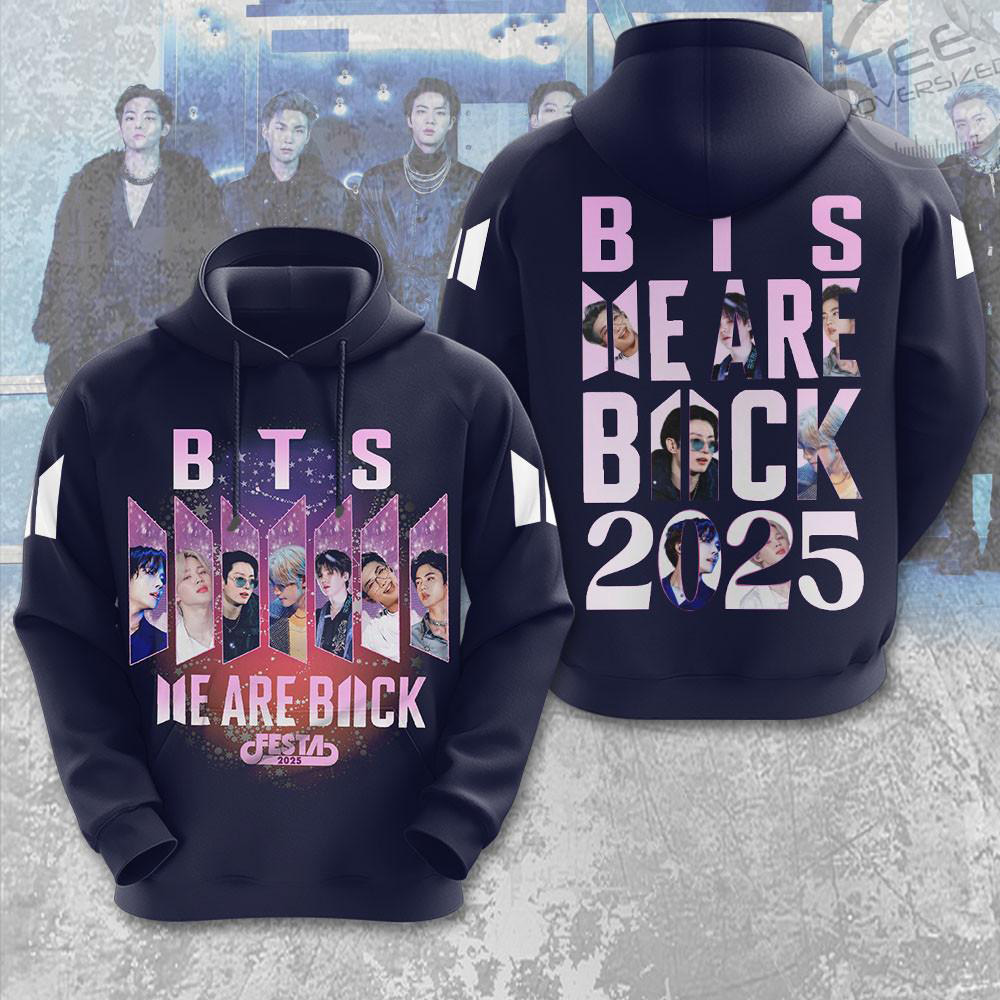 Reunite with your bias in the BTS We Are Back T-Shirt Hoodie — a hybrid garment combining the laid-back look of a tee with the warmth of a hoodie. Crafted from a breathable cotton-poly blend, it features bold “We Are Back” BTS graphics, a roomy hood, ribbed cuffs, and a kangaroo pocket for convenience. Designed with a relaxed unisex cut, it flatters all body types. Available in sizes S–5XL. Ships worldwide within 3–7 business days.