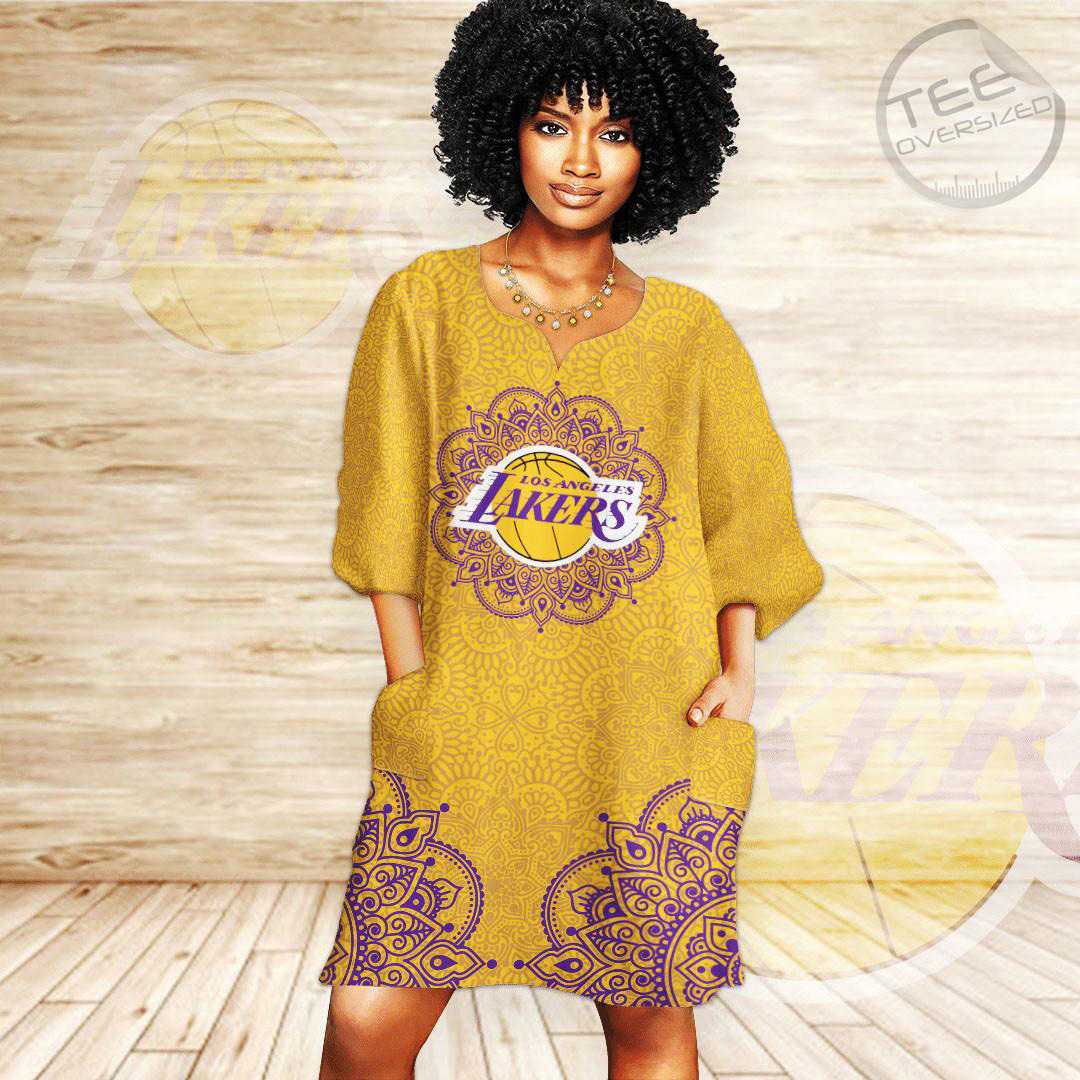 Los Angeles Lakers Dashiki Dress: flowy dashiki style in purple & gold, stretch polyester blend, perfect statement for game day or casual flair.