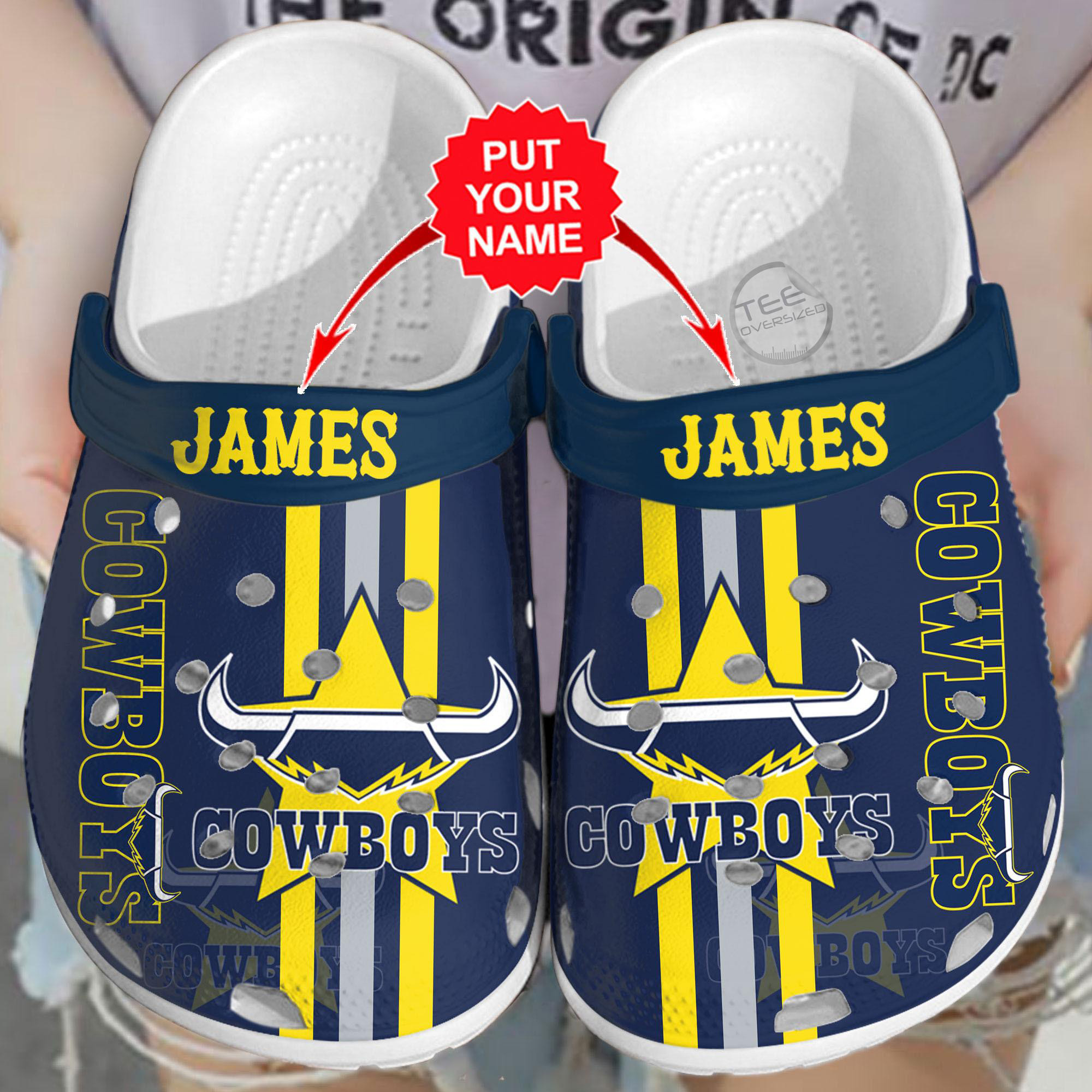Personalized Cowboys Crocs — custom name, team logo colors, slip-on EVA, quick-dry & comfy for every fan.